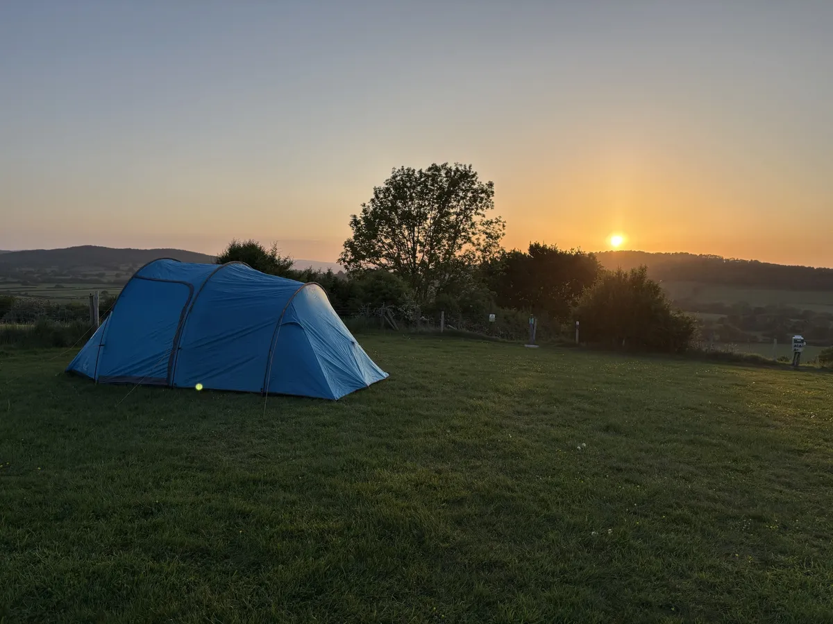 A blue tent is set up on a grassy field with a scenic view of hills in the background. The sun is setting creating a warm glow in the sky. Green trees and grassy areas surround the tent.